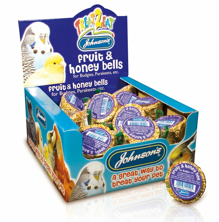 Fruit & Honey Bells for Budgies. Give your cage birds a treat with these individually wrapped honey enriched bells, made with selected seeds and various dried fruits including apple, banana, apricot, raisins and currants.