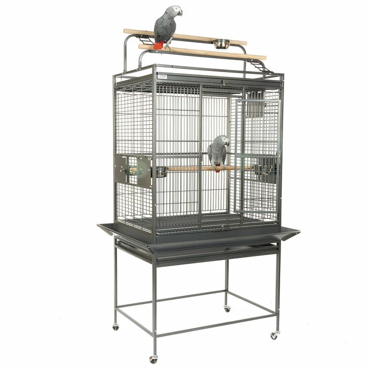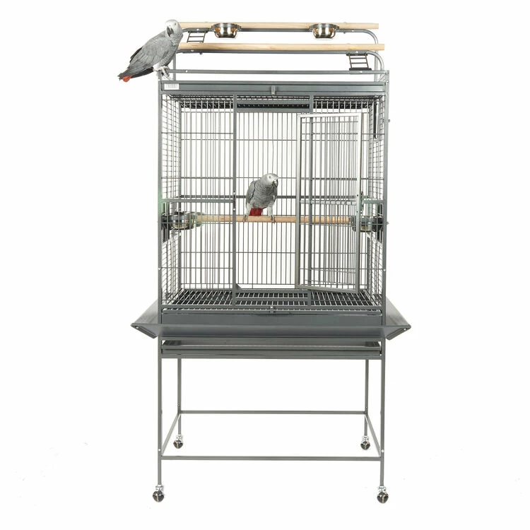 The Dakota is a large, Raised Base parrot cage for medium parrots including African Greys and Amazons, it Features a large opening from door, a multi leveled play top, and a removable tray and grill that are raised off the ground for easy access and cleaning. The cage includes, 1x Internal Perch, 2x External Playtop Perches, 2x Playtop Bowls, 3 Internal Bowls & 1x set of removable seed catchers.